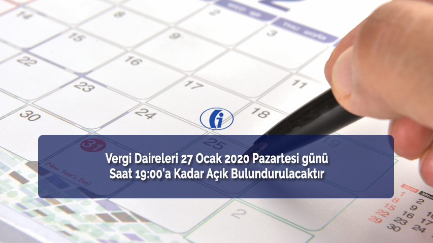 Vergi Daireleri 27 Ocak 2020 Pazartesi günü saat 19:00'a kadar açık bulundurulacaktır