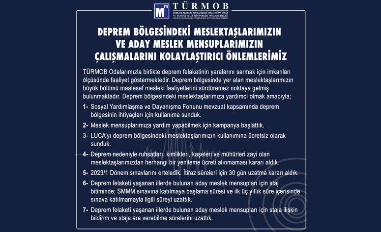 Deprem Bölgesindeki Meslektaşlarımızın ve Aday Meslek Mensuplarımızın Çalışmalarını Kolaylaştırıcı Önlemlerimiz